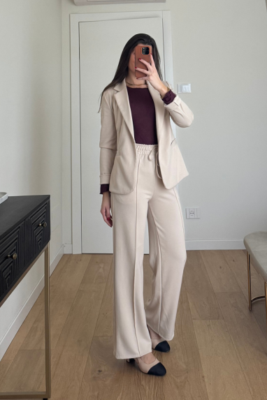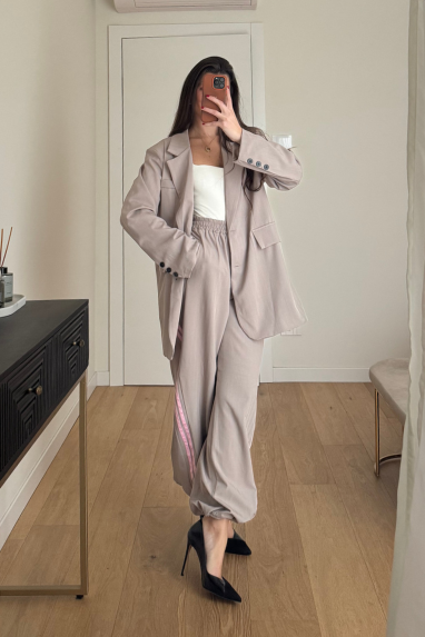 Tailleur sporty-chic composto da blazer monopetto e pantalone con elastico in vita ed elastico regolabile...