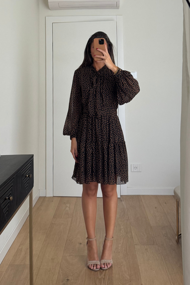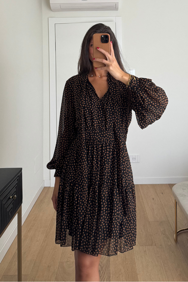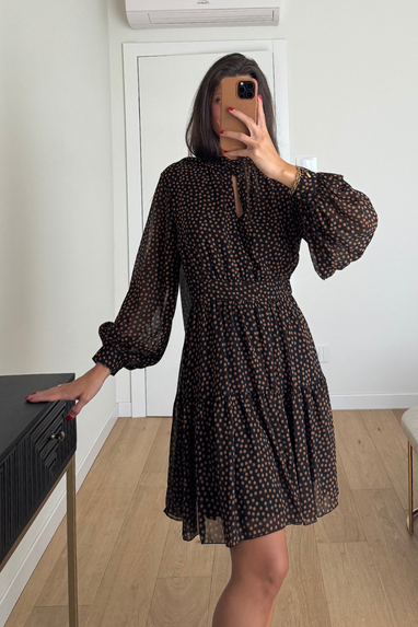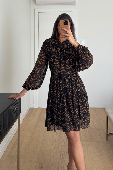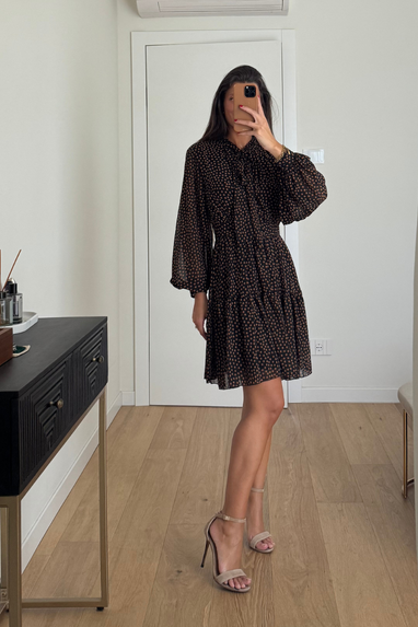 ECO Abito a pois con fiocco al collo, manica a palloncino, tessuto chiffon.