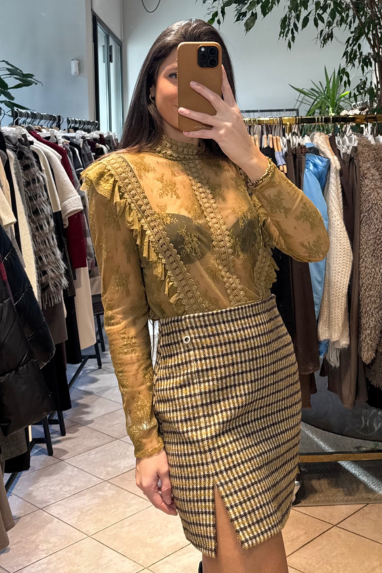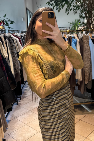 ECO Blusa pizzo con rouges, collo alto e bottoncini chiusura sul collo.