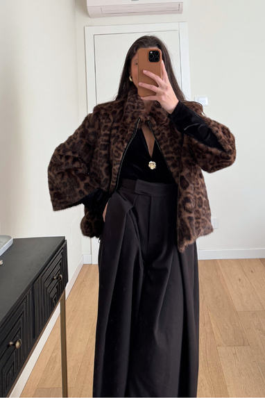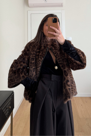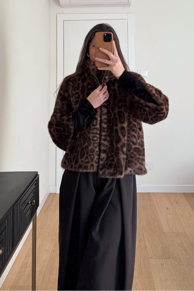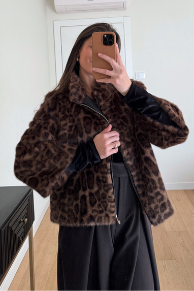 ECO Eco pelliccia corta animalier con zip e manica tre quarti.