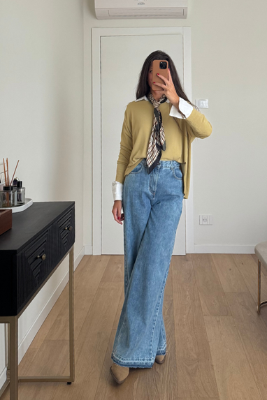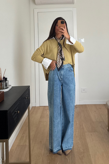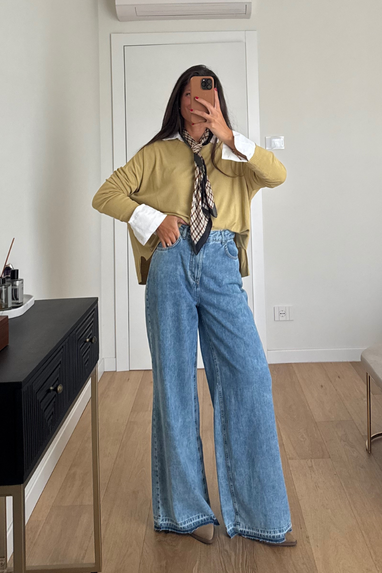 ECO Jeans palazzo taglio vivo, classico cinque tasche con cerniera e bottone frontale.
