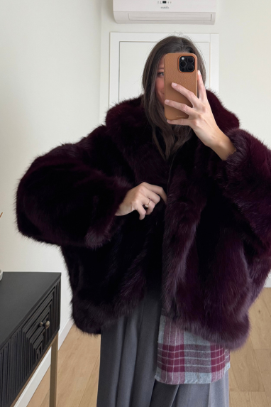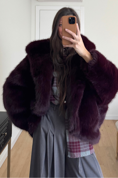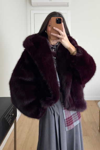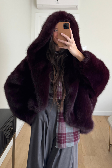 Ecopelliccia over con cappuccio, chiusura con gancino frontale nascosto.