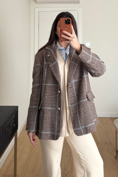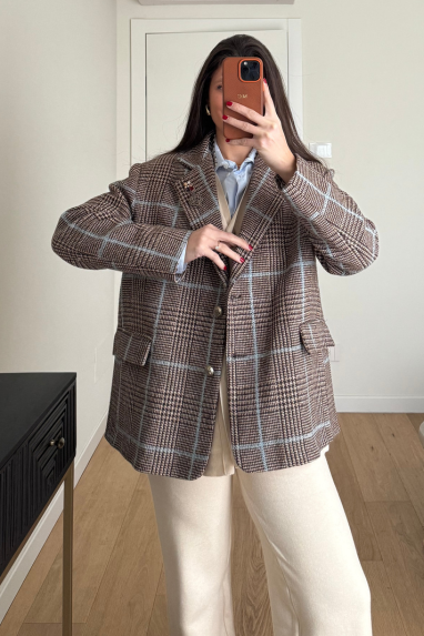 Giacca macro check contrasto azzurro, monopetto con doppio bottone.
