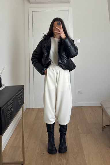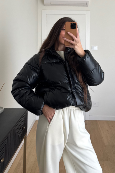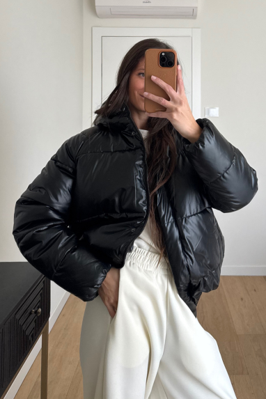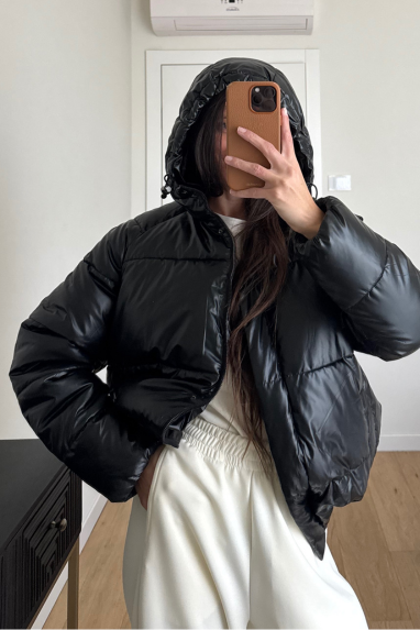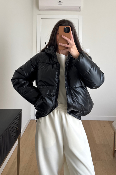 Piumino con cappuccio, lacci laterali regolabili per arricciatura. Cerniera e bottoni di chiusura.